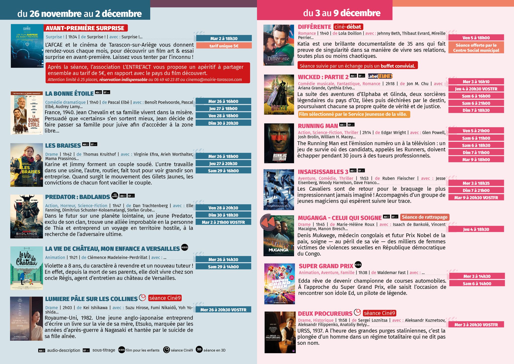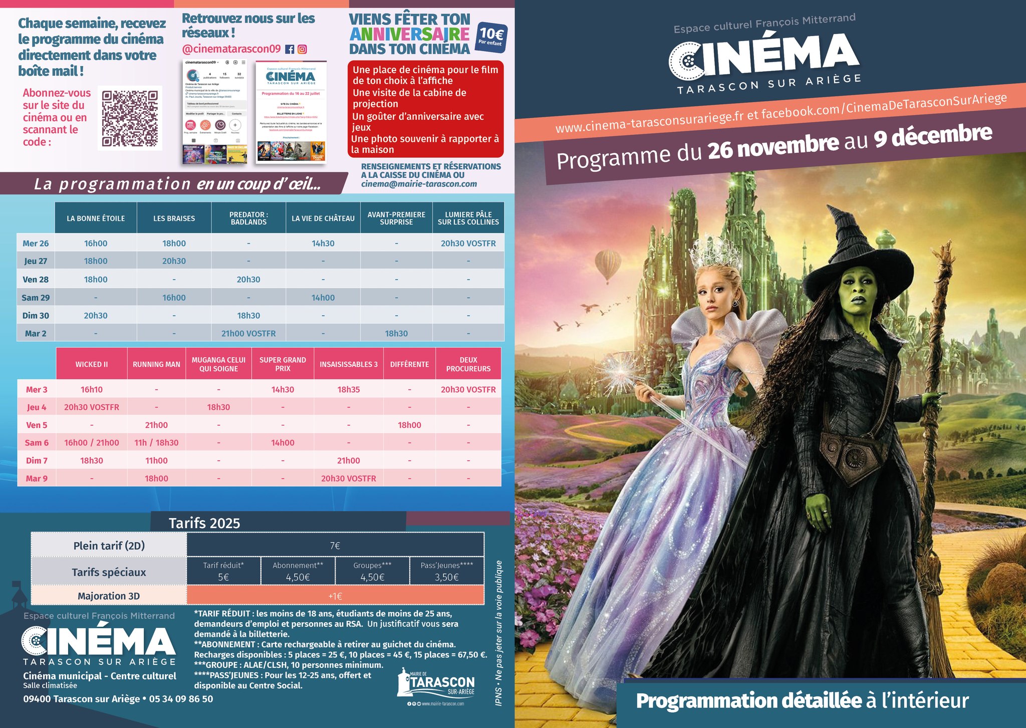 Programme à disposition dans le bâtiment ou sur le site de la mairie : https://cinema-tarasconsurariege.fr/